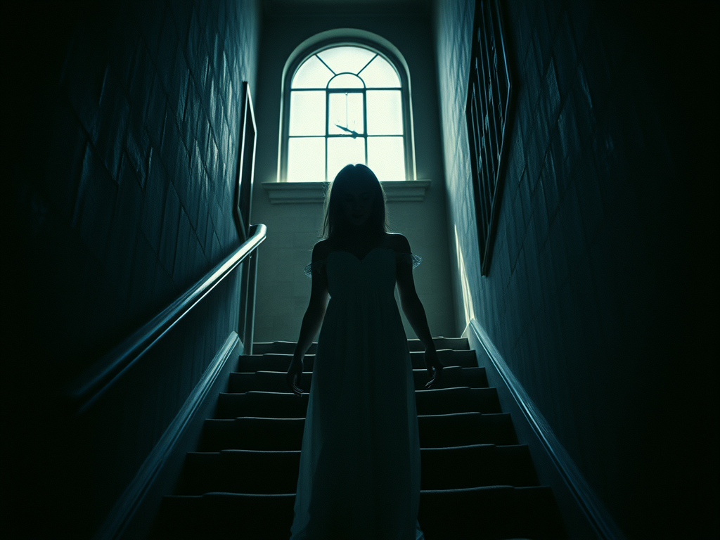Abrió la puerta del caserón con la enorme llave metálica, y quedándose en la entrada, y dejando la puerta abierta (tal vez temeroso por si tenía que salir corriendo), enfocó al interior de la casa; paseó la linterna por el oscuro recibidor y de pronto, en el preciso instante en que un terrorífico relámpago iluminaba toda la casa, la visión de una mujer a los pies de la escalera, vestida con un camisón, le hizo soltar al mismo tiempo un grito y la linterna, que cayó al suelo produciendo un fuerte estruendo. A pesar de la emisión de su poca luz, pero gracias en definitiva a ella, afortunadamente no le costó encontrarla. Se levantó casi inmediatamente asiéndola como si fuera no solo su medio de visibilidad, sino una posible arma en caso de tener que usarla. Volvió a enfocar el rincón donde había visto a la «aparición» pero allí no había nadie; siguió recorriendo el recibidor de izquierda a derecha con el fino halo de luz y cuando enfocó a su derecha, allí estaba, casi pegada a él, mirándolo fijamente.