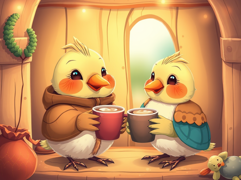 El pajarito Anteojitos, es muy chiquitito, vive en un bosque lleno de preciosas flores de colores y árboles de hermosas hojas verdes. Su amiguito Pepito ha venido a visitarlo. Pepito se había ido a vivir a un valle cerca de las montañas del pirineo que se llamaba el Valle Churumbel, donde hacía mucho frío. Pepito le trajo un regalo a su amiguito Anteojitos: un confortable y exclusivo chaquetón de piel de ante de color marrón, forrado en su parte interior de un grueso borreguito, que es una lana especial de oveja que se utiliza para hacer chaquetones que resulten ser requetecalentitos y supersuaves. Anteojitos, entonces, muy agradecido, invitó a su amigo Pepito a tomar un chocolate caliente y unos churros frente a la chimenea de su agradable choza que compró al dejar el nido de sus padres, hacía justamente unas semanas.