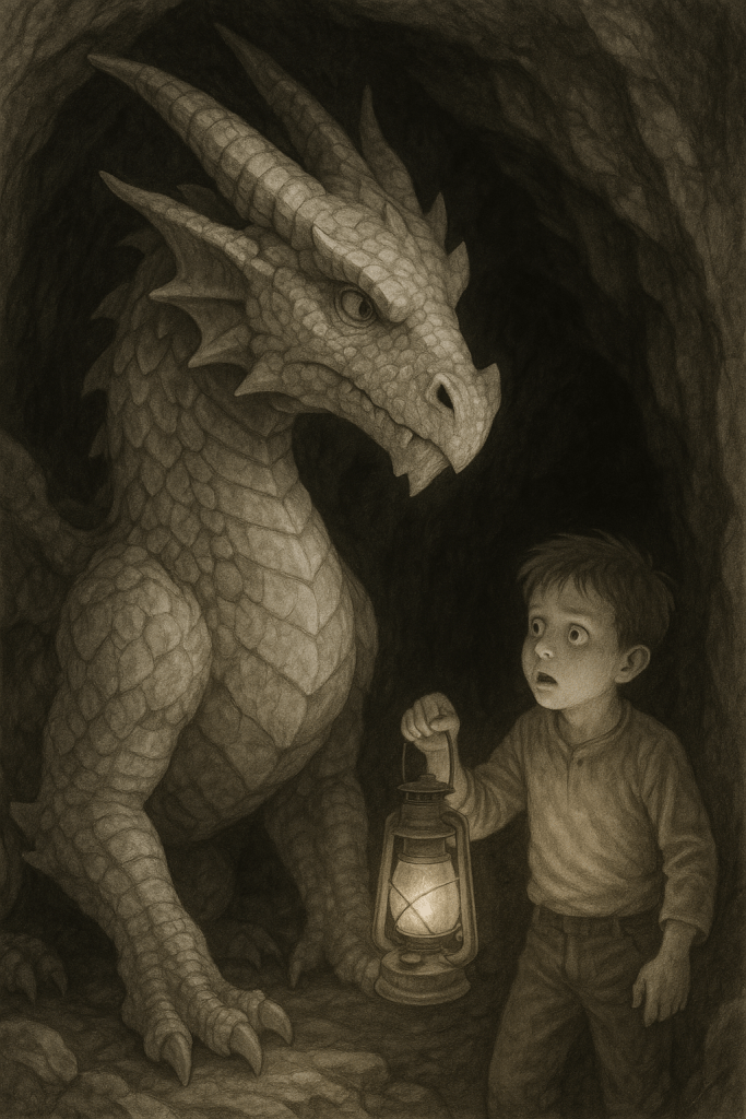 Pronto vieron la cueva del dragón. Desde afuera, no parecía tan peligrosa ni espantosa como la gente decía, pero al entrar adentro y ver que estaba tan oscura, la verdad es que se asustaron un poco. Por suerte, Carlos había metido en su mochila la linterna que lo acompañaba a hacer todas sus excursiones, y al encenderla, un increíble grupo de murciélagos, se les echó encima chillando hasta que por fin salieron de la cueva. Aún sin reponerse del buen susto que se habían llevado, valientemente, Carlos y Tiveti siguieron adelante resueltos a encontrar lo que habían venido a buscar. Caminaban con cuidado porque el suelo estaba lleno de piedras y barro. El niño cogió entonces a la pequeña, y la llevó el resto del camino en brazos. De repente, a lo lejos, vieron brillar una tenue luz, y al acercarse, comprobaron que se trataba del resplandor que ofrecían las piedrecitas blanquísimas del anillo que, tal y como había dicho el mago, estaba en uno de los dedos de la pata derecha del dragón blanco de piedra. Asombrados por el feroz aspecto del animal, que parecía que iba a cobrar vida y echarse sobre ellos en cualquier momento, siguieron caminando despacio, escuchando solamente los latidos de sus asustados corazones, hasta llegar a la altura de las patas del temible dragón.