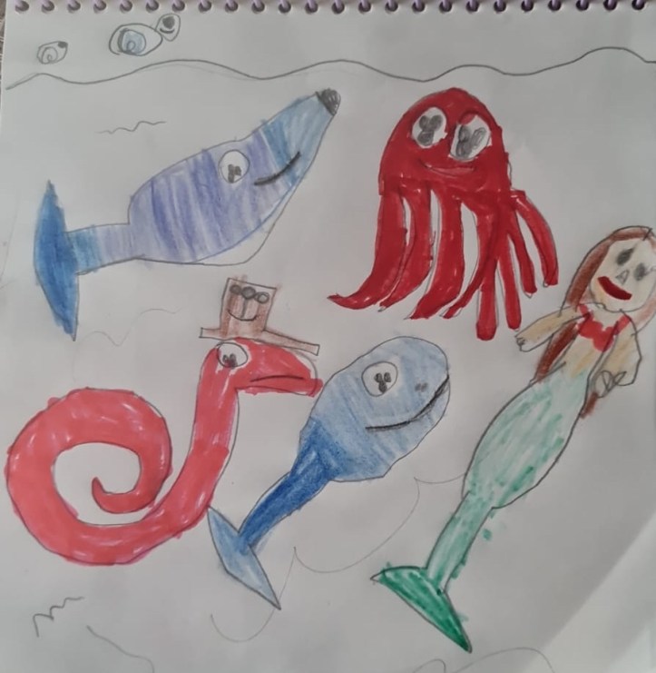 Primera fogata literaria infantil, diurna y nocturna entre México y España, preparada por nuestra querida profe Sari, de Colorfrutal. Aquí tenemos el dibujo de Rafaella (Rafa), que ha representado con muchísimo arte, los personajes de tres de los cuentos que leímos en esta reunión de amigos tan maravillosa y especial. Aquí vemos al tiburón del cuento Lupo, el pulpo, junto al propio Lupo y un caballito de mar muy elegante, Lito, que luce su sombrero de copa, con un motivo de un ancla, muy marinero él😏😍; a Elena, la ballena y al mosquito Quito, con sus nuevas gafas. Todos muy felices junto a la sirenita Rafa.