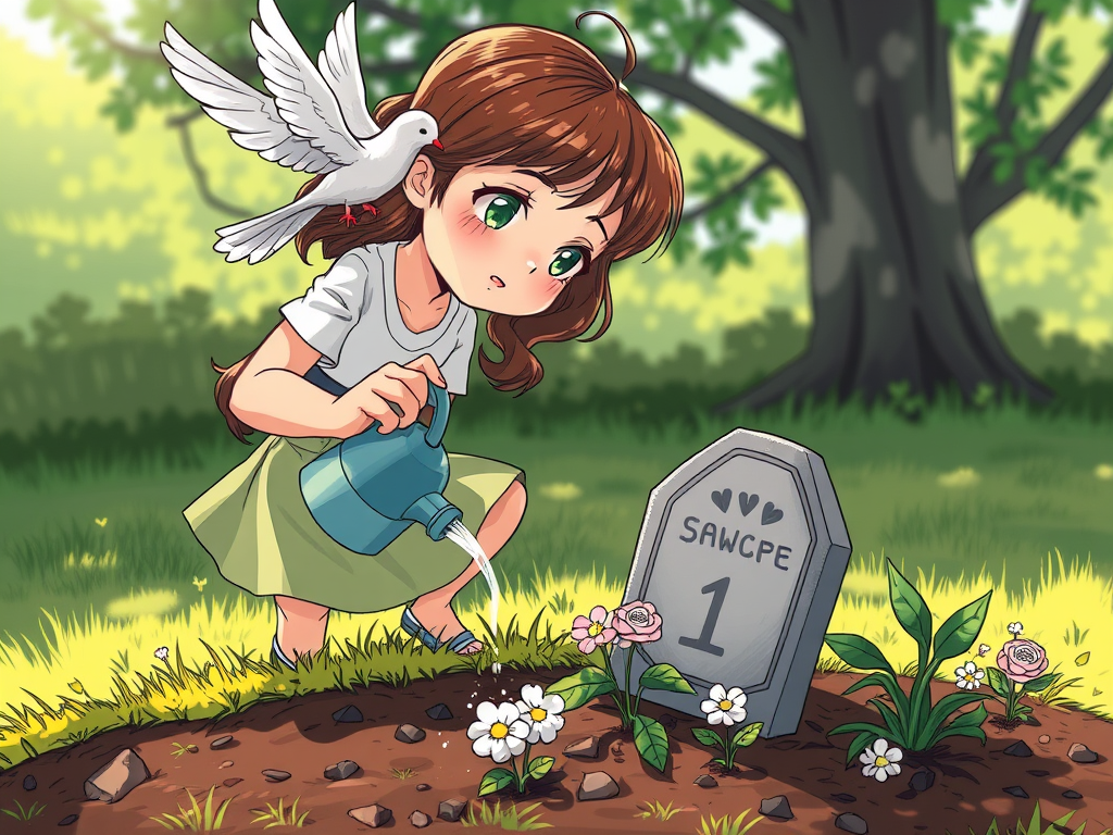 Conejito observaba a la niña mientras regaba esa parcela de tierra donde había una piedra con unas iniciales y unas florecillas. A una de las flores, le faltaba una hojita, y conejito, pensó que tal vez, esa hojita era la que nacía de la rama del árbol que empezaba a crecer en aquella parcela, y quizá significaba, que de él nacerían flores tan bonitas como aquellas. Palomita siempre acompañaba a la niña, ninguna de las dos estaba triste, sabían que el agua mágica y densa con la que regaban el descanso de Palomito, podría devolverle la vida de otra forma.